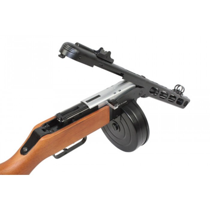 ППШ-41 расшифровывается как Пистолет-Пулемет конструкции Шпагина, он был разработан в 1941 году, именно тогда его и приняли на вооружение Красной Армии. ППШ-41 имеет калибр 7,62×25 мм TT, весит данное оружие 5,45 кг вместе с барабаном, куда помещается 71 патрон, 4,3 кг с рожком на 35 патронов; 3,63 кг без магазина, длина ППШ-41 составляет 843 мм, отдельно длина ствола равна 296 мм, скорострельность 900 выстрелов в минуту, дальность эффективного поражения 200 метров.