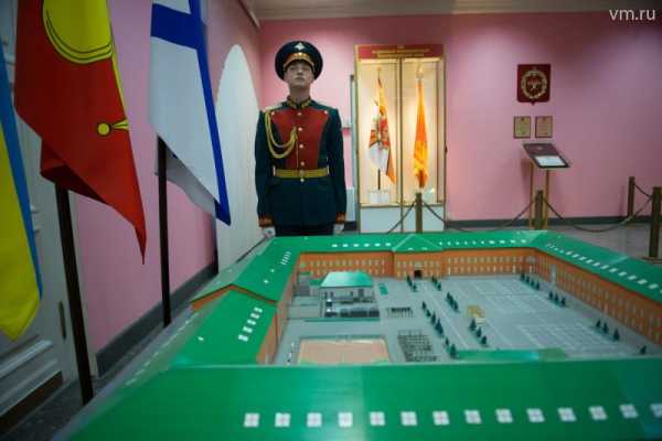 Рядовой Дмитрий Анхимов стоит навытяжку возле знамен и макета казарм Преображенского полка ФОТО: Наталья Феоктистова, «Вечерняя Москва»