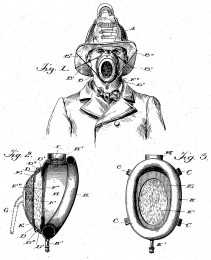 Металлическая канистра на передней части маски содержала переменные слои фильтрующих материалов: древесного угля, извести и пропитанной глицерином ваты. В дополнение к канистре, патент описал простую изолированную систему защиты, в которой пользователь вдыхает и выдыхает через трубы, ведущие к воздушному резервуару, носимому на спине. В этой дополнительной конфигурации фильтр, содержащий известь, удалял бы лишний углекислый газ из дыхательной системы.