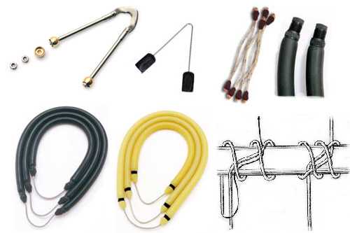 Тетива — форма и материал, из которого она сделана, — очень важны. Самая простая — V-образная проволока 1,3 — 1,6 мм диаметром, но она и ломается чаще. Ta же проволока, но согнутая пружинкой, более надежна и долговечна. Самые надежные и удобные модели тетивы — тетива с серьгой — выпускаются в трех вариантах: согнутая из пластины серьга; серьга из стального прутка с выемкой под зазубрину гарпуна; тетива из стального троса. Важно постоянно контролировать состояние тетивы, чтобы она не сломалась случайно при зарядке. В самодельных ружьях или в случае ремонта используют самодельную тетиву из проволоки 3-3,5 мм, согнув ее в форме подковы. Центральная ее часть расклепывается в месте зацепа, а на концах напаиваются или навариваются шарообразные утолщения. Резиновые тяги имеют внутри отверстия, шары вводятся в отверстия на 20 — 25 мм, а затем накладывается марка. Лучшая марка — узел двойной констриктор из капронового шнура толщиной 1-1,5 мм. Сломавшаяся во время заряжания тетива может сильно поранить вам руки, поэтому на охоте необходимо постоянно пользоваться перчатками.