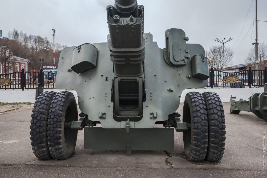 Оригинально была решена проблема колеса, для более легких орудий обычно применялись колёса от ГАЗ-АА или ЗИС-5. Но для нового орудия они не подходили. Колёса от пятитонки ЯАЗ оказались слишком тяжелыми и большими. Тогда была взята спарка колёс от ГАЗ-АА, что позволило вписаться в заданные массу и габариты. Колеса от грузовика ГАЗ-АА имели усиленную резиновую шину, и специальную ступицу колес. Снабженные такими колесами пушки могли транспортироваться механической тягой с достаточно большими скоростями.