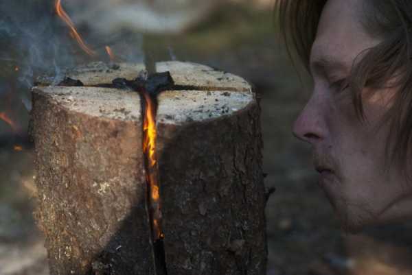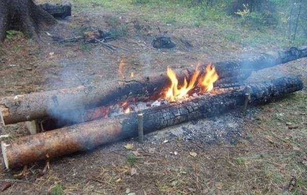 Разводить огонь можно несколькими способами. Если подпирающее бревно не очень толстое, и соединенные концы бревнышек находятся невысоко над землей, можно развести костер по типу «шалаш» непосредственно под ними. Языки костра подожгут бревнышки и они начнут самостоятельно гореть.