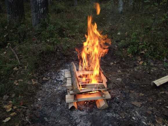На «настил» под нависающие концы бревен верхних «этажей» кладется растопка и поджигается. Огонь от растопки поджигает верхние «этажи» — и костер входит в рабочий режим. Огонь при горении будет постепенно смещаться от места поджигания к противоположным концам бревен, создавая большое количество углей и жара.