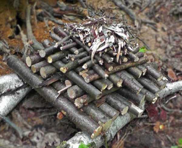 Если подпирающее бревно достаточно толстое или разжигать огонь снизу неудобно из-за снежного покрова, можно все бревна «веера» соединить между собой и разжечь костерок на полученном таким образом настиле. Понятно дело, что разжигать костер нужно только на тех концах бревен, которые возвышаются над землей. После того, как огонь разгорится, нижние лежащие на земле концы бревнышек снова разводятся в стороны.