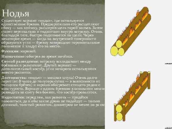 Нодья Существует вариант «нодьи» , где используется единственное бревно. Предварительно его расщепляют сбоку — как книжку, расширив щель парой кольев. Затем ставят вертикально и поджигают внутри затравку. Огонь, благодаря тяге, быстро поднимается по щели. Через некоторое время — когда на внутренней поверхности образуются угли — бревну возвращают горизонтальное положение и кладут его на место. Функция: жаровой. Назначение: обогрев во время ночёвки. Способ разведения: затравку закладывают между брёвнами и разжигают. Другой вариант — дополнительный костёр, угли которого используются вместо растопки. Достоинства: «нодья» — мощная штука! Очень долго горит (от 8 часов до полутора суток — в зависимости от толщины брёвен) и хорошо обогревает спящего рядом с ним туриста. Вариант с одним бревном в основании можно разводить на снегу без боязни, что костёр провалится. Недостатки: перед тем, как разжечь — придётся повозиться, да и абы какие дрова не подойдут — только длинный, толстый ровнячок, диаметром не менее 20 -30 см.