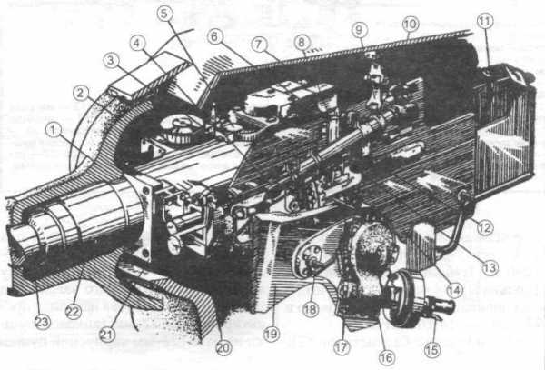 Схема установки пушки ЗИС-С-53 в башне танка Т-34 обр. 1944 г.1 — броневая защита пушки; 2 — кронштейн люльки для установки пулемета; 3 — пулемет; 4 — прицел; 5 — шпонка люльки; 6 — клин затвора пушки; 7 — казенник пушки; 8 — электромагнит электроспуска; 9 — шарнирная подвеска прицела; 10 — боковой уровень; 11 — гильзоуловитель; 12 — маховик углов прицеливания; 13 — спусковой шнур; 14 — левый щит ограждения; 15 — рычаг электроспуска; 16 — подъемный механизм; 17 — выключатели пушки и пулемета; 18 — стопор крепления пушки по-походному; 19 — кронштейн; 20 — кронштейн люльки для установки прицела; 21 — фланец люльки для крепления к броневой защите пушки; 22 — люлька; 23 — ствол пушки