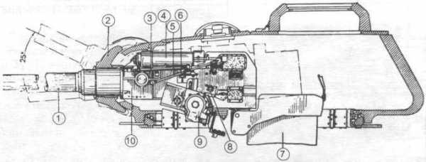 Схема установки пушки Д-25Т в башне танка ИС-21 — тормоз отката; 2 — привод к заслонке объектива телескопа; 3 — державка телескопа; 4 — кронштейн для крепления налобника; 5 — график наполнения накатника; 6 — стопор лотка; 7 — спусковой механизм; 8 — боковой уровень; 9 —отверстие в подвижной бронировке для спаренного пулемета ДТМ; 10 — правая цапфа пушки; 11 — правый кронштейн установки пушки; 12 — кронштейн установки пулемета; 13 — магазин пулемета; 14 — пулемет ДТМ; 15 — наметка люльки; 16 — цилиндр накатника; 17 — цилиндр тормоза отката; 18 — рукоятка затвора; 19 — казенник; 20 — закрывающий механизм; 21 — рычаг ручного спуска ударника; 22 — налобник прицела; 23 — левый кронштейн установки пушки; 24 — левая цапфа пушки; 25 — маска пушки; 26 — отверстие в маске для прицела; 27 — отверстие в подвижной бронировке для прицела; 28 — амортизатор подвижной бронировки; 29 — люлька пушки