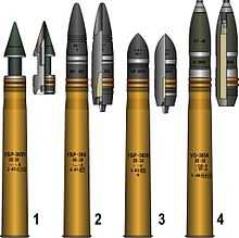 -бронебойный унитарный выстрел массой 11,42 кг с подкалиберным снарядом катушечного типа 53-БР-365П массой 5,0 кг и зарядом 54-Г-365 массой 2,5—2,85 кг; начальная скорость 1050 м/с;