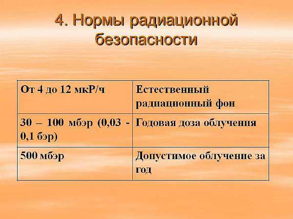 ΠΡΡΠ΅ΡΡΠ²Π΅Π½Π½ΡΠΌ ΡΡΠΈΡΠ°Π΅ΡΡΡ Π·Π½Π°ΡΠ΅Π½ΠΈΠ΅ ΠΎΡ 0,1 Π΄ΠΎ 0,16 ΠΌΠΊΠΠ²/Ρ. ΠΡΠ½ΠΎΡΠΈΡΠ΅Π»ΡΠ½ΠΎΠΉ Π½ΠΎΡΠΌΠΎΠΉ ΡΡΠΈΡΠ°Π΅ΡΡΡ Π½Π΅ Π±ΠΎΠ»Π΅Π΅ 0,2 ΠΌΠΊΠΠ²/ΡΠ°Ρ, Π½ΠΎ ΠΌΠ½ΠΎΠ³ΠΎΠ΅ Π·Π°Π²ΠΈΡΠΈΡ ΠΎΡ ΠΏΡΠΎΠ΄ΠΎΠ»ΠΆΠΈΡΠ΅Π»ΡΠ½ΠΎΡΡΠΈ ΠΈΠ·Π»ΡΡΠ΅Π½ΠΈΡ. ΠΠΎΠΊΠ°Π·Π°ΡΠ΅Π»Ρ Π² 1 ΠΌΠΠ²/ΡΠ°Ρ β ΡΡΠΎ ΠΌΠ½ΠΎΠ³ΠΎ, Π½ΠΎ Π½Π° ΠΏΡΠΎΡΡΠΆΠ΅Π½ΠΈΠΈ Π³ΠΎΠ΄Π° β ΡΡΠΎ Π½ΠΎΡΠΌΠ°, Π½Π΅ ΠΏΠΎΠ΄Π»Π΅ΠΆΠ°ΡΠ°Ρ ΠΏΡΠ΅Π²ΡΡΠ΅Π½ΠΈΡ. Π₯ΠΎΡΡ Π΅ΡΠ»ΠΈ ΡΡΡ Π΄ΠΎΠ·Ρ ΡΠ°Π΄ΠΈΠ°ΡΠΈΠΈ ΡΠ°Π·Π΄Π΅Π»ΠΈΡΡ Π½Π° ΠΊΠΎΠ»ΠΈΡΠ΅ΡΡΠ²ΠΎ ΡΠ°ΡΠΎΠ² Π² Π³ΠΎΠ΄, ΡΠΎ ΡΡΠΎ 0,57 Π² ΠΌΠΈΠΊΡΠΎΠ·ΠΈΠ²Π΅ΡΡΠ°Ρ . ΠΠ΅ΡΡ Π½ΠΈΠΉ ΠΏΡΠ΅Π΄Π΅Π» Π΄ΠΎΠΏΡΡΡΠΈΠΌΠΎΠ³ΠΎ, Π½ΠΎΡΠΌΠ° β ΡΡΠΎ Π½Π΅ Π²ΡΠ΅Π³Π΄Π° Π½ΠΎΡΠΌΠ°, ΡΠΊΠΎΡΠ΅Π΅, ΡΠΆΠ΅ ΠΏΠΎΡΠΎΠ³ ΠΊ Π°Π½ΠΎΠΌΠ°Π»ΠΈΠΈ.