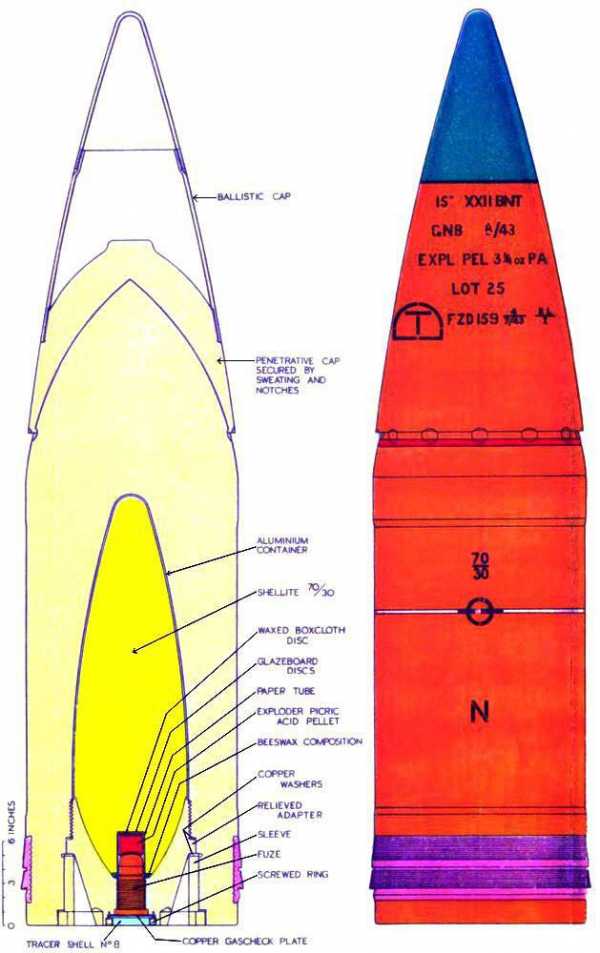 381 мм бронебойный снаряд в разрезе. Обратите внимание на коэффициент его наполнения: кол-во взрывчатки не более 2,5% от массы боеприпаса.