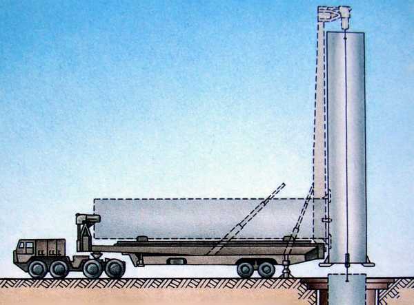 | Схема перестановки ракеты с полуприцепного установщика в шахтную пусковую установку |