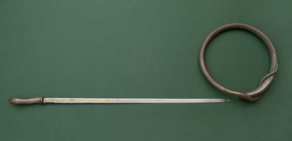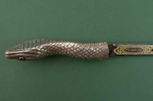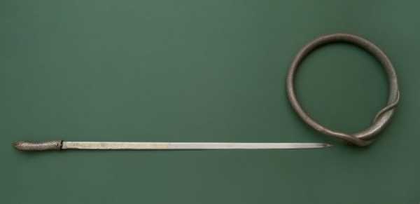 Это — шедевр испанского оружейного искусства. Невозможно поверить, но перед вами шпага.Серебряная рукоять выполнена в виде передней части туловища и головы ядовитой змеи с глазами-вставками из розового стекла. В нижней части рукояти вмонтирована пружинная защелка, фиксирующая клинок в ножнах.