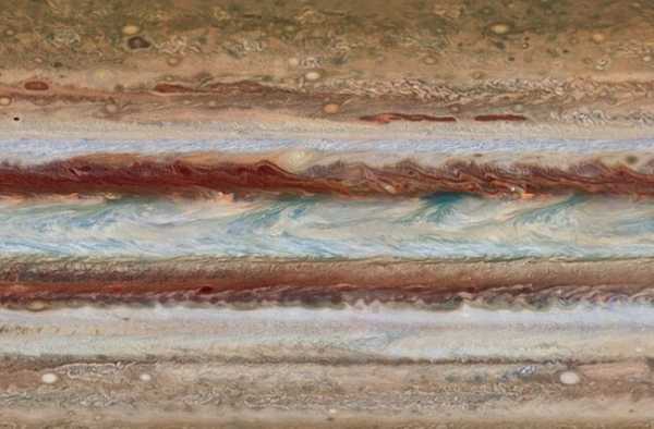 Удивительная окраска Юпитера состоит из светлых и темных поясных зон, которые, в свою очередь, вызываются постоянными мощнейшими ветрами, дующими с востока на запад со скоростью 650 километров в час. Зоны со светлыми облаками в верхних слоях атмосферы содержат замороженные, кристаллизованные частицы аммиака. Более темные облака содержат различные химические элементы. Эти климатические особенности постоянно изменяются и никогда не задерживаются на долгие интервалы.
