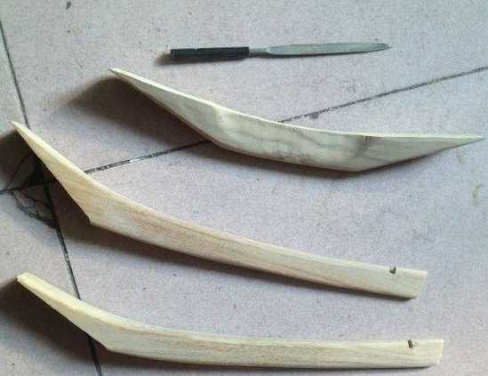 После того как заготовка вырезана потребуется выработать форму рукоятки используя полукруглую, острую стамеску. Неплохим помощником в такой работе показал себя рашпиль плоской, полукруглой формы. С его помощью можно обработать поверхность заготовки на черновую. В самом конце придется взять в руки шлифшкурку. Сперва деталь обрабатывается грубой шлифшкуркой, потом мелкой, на чистовую используем нулевку. Должна получиться заготовка, как на фото.