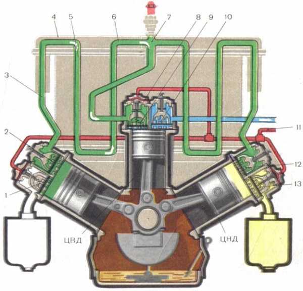 Как только давление в главных резервуарах, а значит, и под клапаном 2 достигнет 0,85 МПа (на такое давление отрегулирована пружина 4), клапан отожмется от своего седла. За счет увеличившейся поверхности, на которую давит воздух, происходит быстрое прижатие клапана к своему верхнему седлу, т.е. регулятор давления включается и разобщает разгрузочные устройства компрессора, а также полость над золотником гидромуфты 11 с атмосферой. Одновременно воздух из главных резервуаров через радиальный зазор между корпусом 1 и клапаном 2 по трубке 13 поступит к штуцерам, ввернутым в крышки цилиндров высокого и низкого давления. В результате при движении поршня в каждом из трех цилиндров будет происходить всасывание и выталкивание воздуха через открытые всасывающие клапаны.