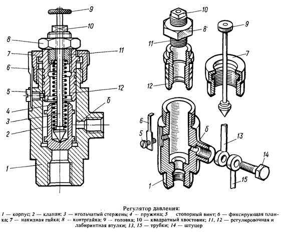 Регулятор давления управляет работой компрессора, не допуская его перегрузки. В расточке стального цилиндрического корпуса 1 помещен бронзовый клапан 2, выполненный в виде стакана с двумя коническими поясками. Нижним пояском клапан притерт к посадочному седлу в корпусе 1, а верхним – к посадочному седлу на нижнем торце лабиринтной втулки 12, которая вставлена в корпус сверху. На наружной поверхности втулки проточены три лабиринтные канавки, а в нижней ее части профрезерован паз а под хвостовик стопорного винта 5, ввернутого в корпус 1 и не допускающего проворот втулки 12.