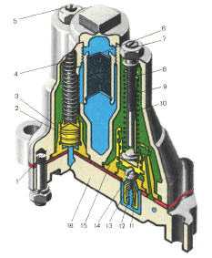 Регулировка усилия пружин на включающий и выключающий клапаны производится при помощи винтов с нажимными шайбами. После регулировки винты контрогаятся.