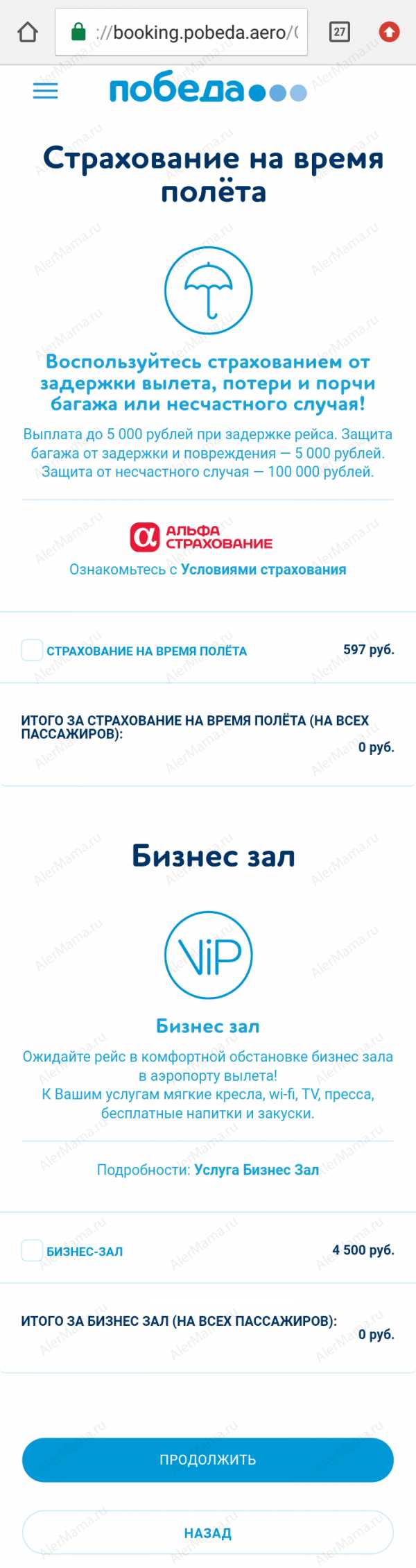 Если хочешь докупить багаж или выбрать места, сделай это до прохождения регистрации. Хотя в момент оформления это также возможно. Сама процедура, во многом похожа на процесс оформления брони на билет: проверь данные пассажиров, откажись от выбора места, багажа и страховки (или докупи нужное) и подтверди прохождение регистрации.