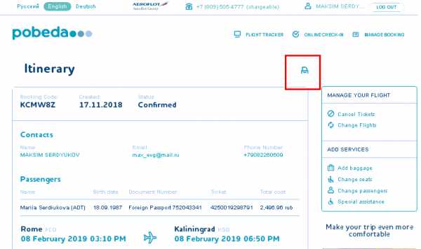 Регистрируйся в личном кабинете на сайте pobeda.aero, если не сделал этого при покупке билета. Это упростит управление бронью. Лучше сделай это дома до вылета за границу.
