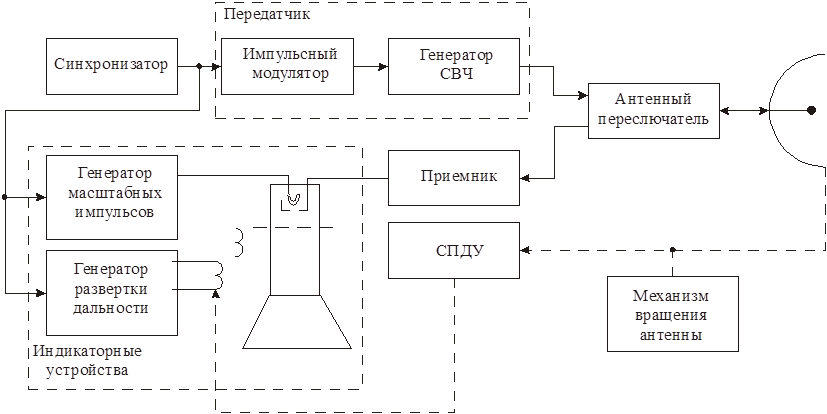 Представим структурную схему гипотетической РЛС, в основу работы которой положен активный метод радиолокации при импульсном режиме излучения, то есть с использованием импульсных зондирующих сигналов в виде чередующихся во времени отрезков колебаний.