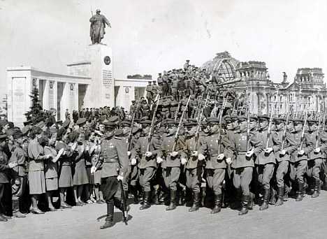 Войска Красной армии на марше в Берлине, 1946 год. Жертв насиловали в среднем по 12 раз во время наступления Красной Армии на столицу нацистской Германии.