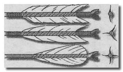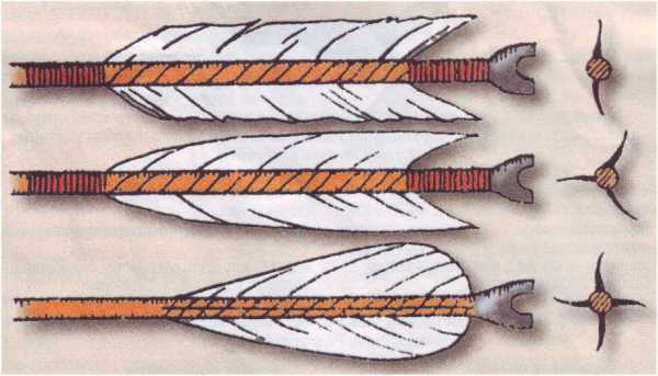 Наконечники укрепляли на комлевом конце древка, который у живого дерева был обращен к корню. Это объяснялось тем, что древесина к комелю прочнее. Чтобы придать стреле в полете устойчивость, на нее крепили оперение. Перьев на стрелах бывало от двух до шести, но в основном использовалось два-три пера, симметрично расположенных по окружности древка. Перья должны были быть ровными, упругими, прямыми, среднежесткими. Лучше других подходили перья орла, грифа, сокола и морских птиц. Все лопасти оперения должны были быть одинаковыми по длине, ширине и весу и притом нагибаться в одну сторону: это закручивало летящую стрелу. Чем тяжелее была стрела, тем длиннее и шире делалось оперение. В среднем длина оперения колебалась между 6 и 10 см.