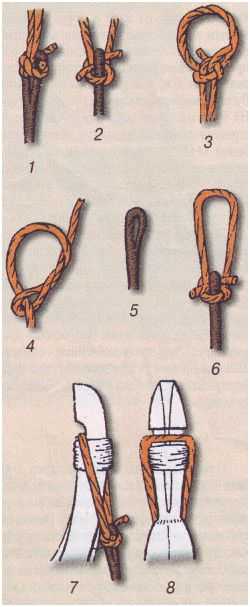 1, 2 – вид (сбоку и спереди) узла петли на шелковой тетиве русского лука (XVII век): узел среднеазиатский (хорасамский),