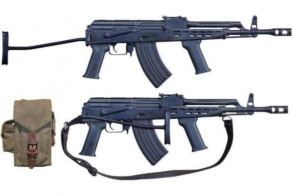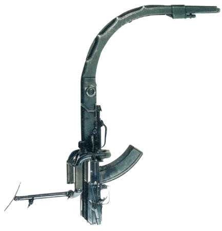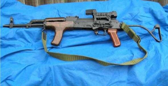 Складная версия автомата Калашникова, созданная для Воздушно-десантных войск. На фотографии изображен автомат с барабанным магазином от РПК (ручного пулемета Калашникова) на 75 патронов. Кроме того, автомат на фотографии комплектуется глушителем, что достаточно редко встречается на АК и их копиях.