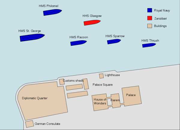 Британская эскадра в составе бронепалубного крейсера 1-го класса «Сент-Джордж», бронепалубного крейсера 3-го класса «Филомел», канонерских лодок «Дрозд», «Воробей» и торпедно-канонерской лодки «Енот» выстроилась на рейде, окружив единственный «военный» корабль занзибарского флота — построенную в Великобритании султанскую яхту «Глазго», вооружённую орудием Гатлинга и малокалиберными 9-фунтовыми орудиями.