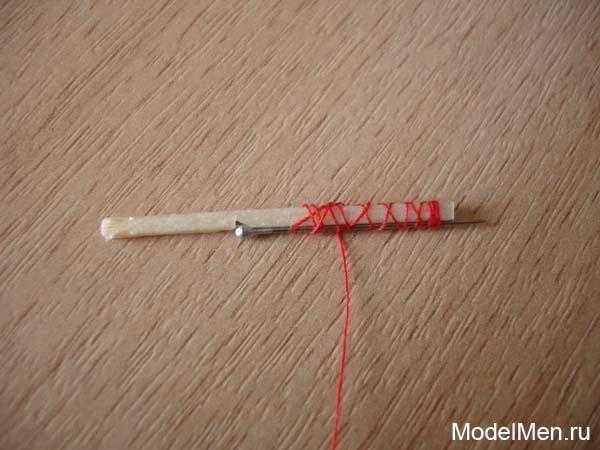Как и в первом случае вырезаем в спичке углубление под шляпку иголки и приматываем иголку нитками.