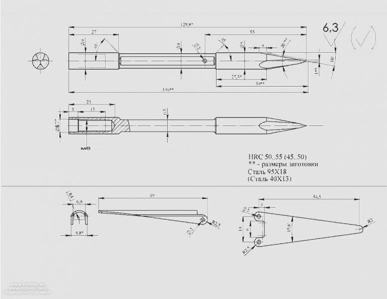 Наконечник Зелинского (Х-образный) – самая популярная модель среди наших подвохов, которые по большей части охотятся на пресноводных водоемах. Главные его достоинства – незначительное сопротивление в полете и отменная проникающая способность. Такой гарпун не сносит при стрельбе с дальней дистанции, он отлично держит подстреленный трофей, а если повезет подобраться к стае, то и не один. Известны случаи, когда с его помощью удавалось подстрелить и удержать сразу двух и даже трех рыб. Но у этой модели есть два серьезных врага: речной песок и твердые предметы. После контакта с ними наконечник сразу выходит из строя (заклинивает, гнется, ломается).- Наконечник Лагутина (Т-образный) – тоже не выдерживает прямого попадания в твердые предметы, кроме того он слишком замысловат в плане конструкции. Плюсы: летит ровно, попадает точно, после попадания автоматически раскрывается и отлично держит добычу.