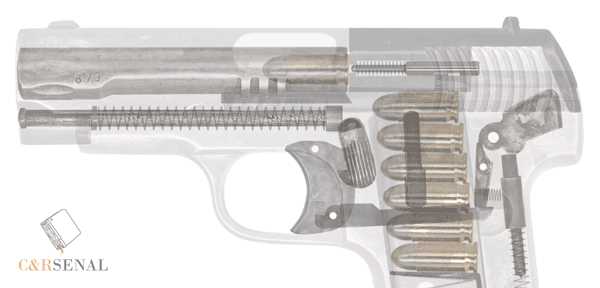 Передняя часть пистолета состоит из блока, где сверху находится возвратная пружина, а снизу в нем расположен ствол. Возвратная пружина соединяется с затвором штангой с зацепом.