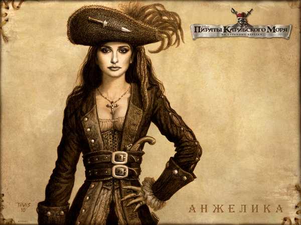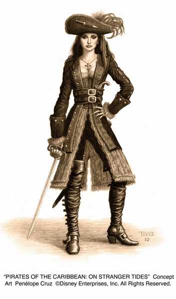 Эта иллюстрация Майлса Тивса показывает сложность и красоту, которую художник по костюмам Пенни Роуз привнесла в костюмы для Анжелики (Пенелопа Круз). «Изначально дизайны для костюмов Анжелики были более девичьи, но это не сработало», — отмечает Роуз. – «Поэтому в конце концов я создала мужской камзол, обрезанный для женщины, как подобающий женщине пиратке».