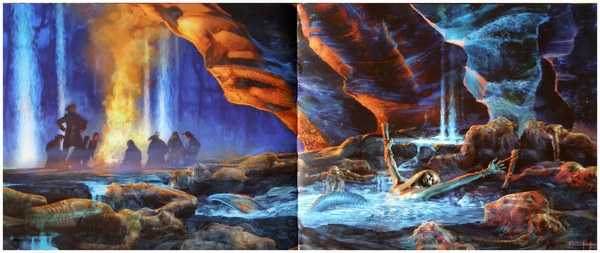 Иллюстрация Дина Тшеттера. Невероятная красота заводей в джунглях скрывает ужасающие поступки, что происходят среди этих красот. Сюда затаскивают русалок и связывают ради, как говорит Черная Борода, «урожая их слез», которых жаждут аморальные искатели для ритуала у Источника Молодости.