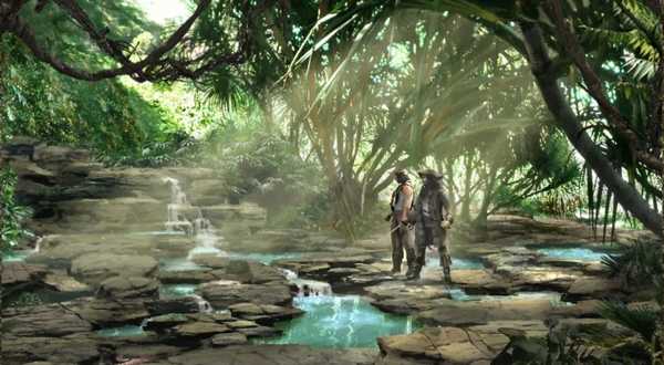 Концепт испанского лагеря работы Саймона МакГуайра показывает буйную, влажную атмосферу локации, выбранную для построек – Национальный Тропический Ботанический Сад в Кауаи.