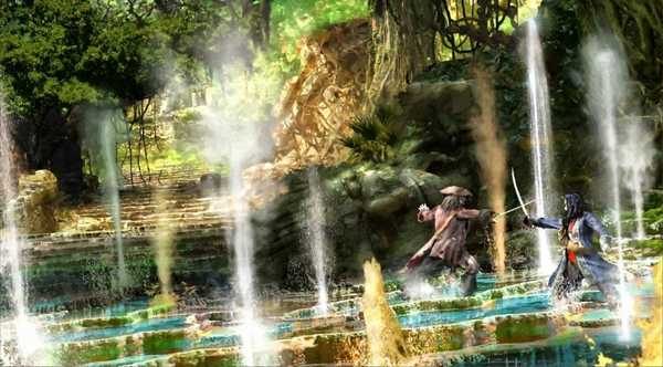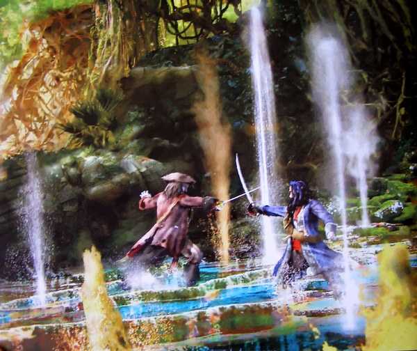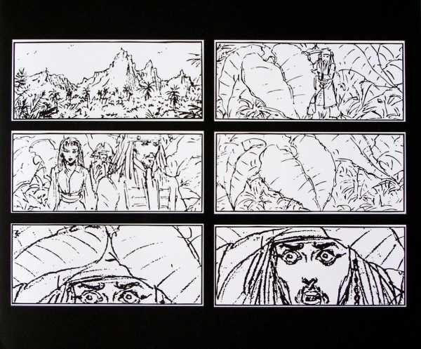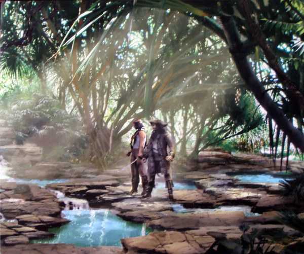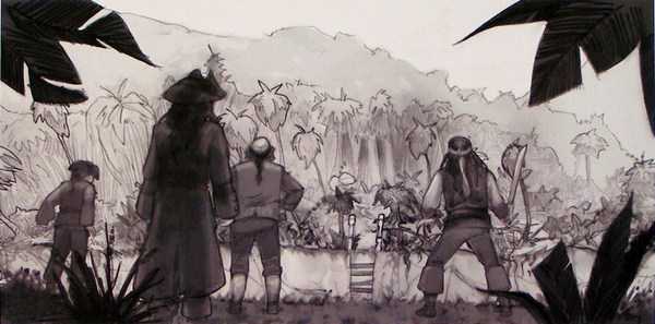 Этот набросок Дона Брауна Мансера показывает разногласия в джунглях между Капитаном Джеком, Анжеликой и Черной Бородой в поисках чаш, необходимых для активации Источника Молодости. Эти красивые локации были найдены в джунглях Кауаи.