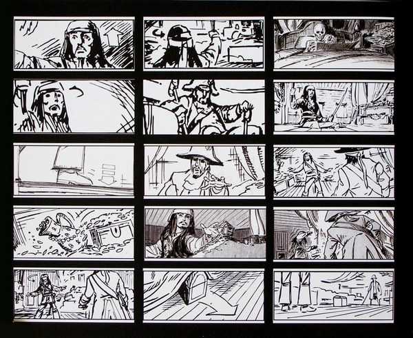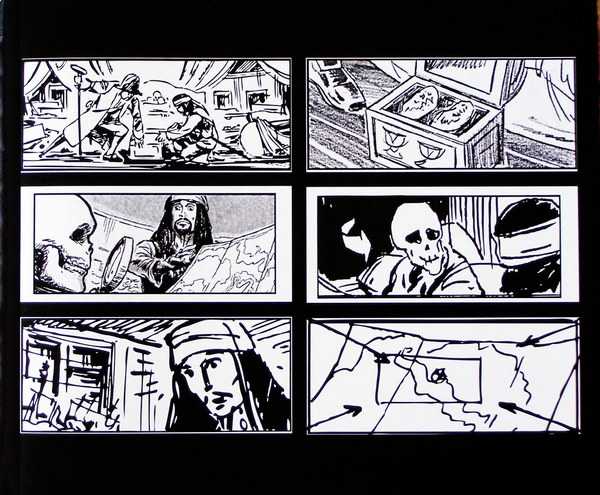 Рик Ньюсом нарисовал эти раскадровки для сцены, в которой Капитан Джек и Барбосса пытаются завладеть чашами, необходимыми для ритуала у Источника Молодости. Они качаются на ненадежно стоящем на скале корабле «Сантьяго» в каюте Понсе Де Леона. Эта съемочная площадка наиболее похожа на оригинальный аттракцион ПКМ в Диснейленде, и возникла в результате исследований Роба Маршалла перед началом съемок фильма «На странных берегах». «Это фантастическая сцена, и я подумал, что это будет здорово, если съемочная площадка будет откликаться на известный аттракцион под названием «Каюта Капитана», где ты видишь скелет капитана на постели, глядящий на карту, окруженный его сокровищами. Мы решили сделать такой скелет Понсе Де Леона для нашего фильма». Декоратор Гордон Сим и его команда создали рог изобилия из мебели, пиратских трофеев, драпировок и других вещей, чтобы воссоздать атмосферу вплоть до запаха. Джерри Брукхаймер добавляет: «Каюта Понсе Де Леона символизирует то, что мы пытались делать во всех фильмах – оставлять отсылку к оригинальному аттракциону, но при этом делать это свежим и волнующим образом».