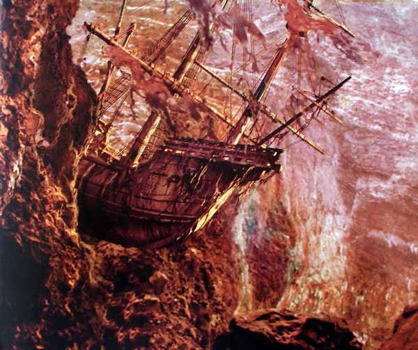 Эта иллюстрация Дина Тшеттера показывает Пенную Бухту после битвы между пиратами и русалками, и корабль «Провидение» атакован русалками и идет ко дну, пока Барбосса и его офицеры беспомощно наблюдают за происходящим.