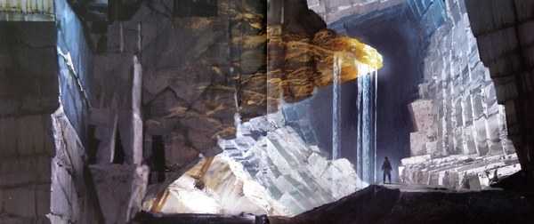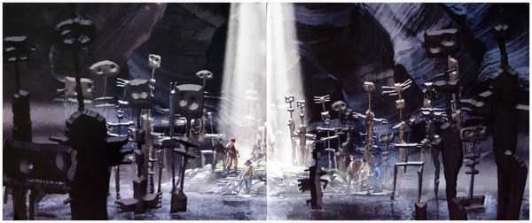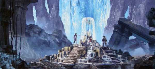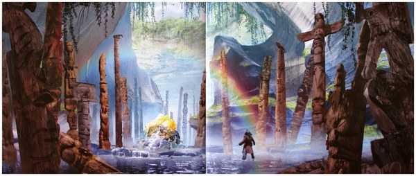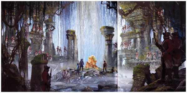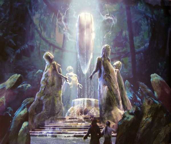 На протяжении эволюции концепта Источника одна тема никогда не поднималась: «Роб Маршалл с самого начала хотел, чтобы Источник был чем-то природным, а не вырезанным и украшенным людьми», — вспоминает Майр, — «это было естественное образование, но у нас появилась идея, что тысячи лет назад Источник был обнаружен людьми, которые построили что-то вроде храма вокруг него, но с тех пор он зарос. Некоторое время мы пытались обыгрывать эту идею насчет деревянных тотемов племенной культуры. Потом мы стали двигаться в направлении руин каменного храма с растущими по нему виноградными лозами, которые разрушают его».