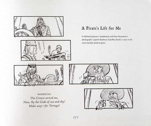 Эта детальная иллюстрация Дина Тшеттера показывает капера Барбосу (Джеффри Раш). Он рассматривает испанский галеон, когда тот идет мимо его корабля, «Провидение», в поисках Источника Молодости.