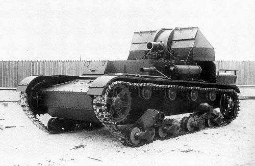 После испытания пехотной САУ АТ-1, проложившей дорогу новому виду артиллерии своей боевой эффективностью, в СССР начались работы над так называемым “малым триплексом”, представлявшим собой универсальный лафет с откидными упорами на базе пехотного танка Т-26. На этом лафете в зависимости от ситуации размещали либо 76-мм пушку образца 1902/30 гг. с увеличенной длиной ствола (СУ-5-1), либо 122-мм гаубицу образца 1910/30 гг. (СУ-5-2), либо 152-мм мортиру образца 1931 г. (СУ-5-3).