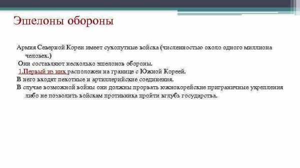Эшелоны обороны Армия Северной Кореи имеет сухопутные войска (численностью около одного миллиона человек. ) Они составляют несколько эшелонов обороны. 1. Первый из них расположен на границе с Южной Кореей. В него входят пехотные и артиллерийские соединения. В случае возможной войны они должны прорвать южнокорейские приграничные укрепления либо не позволить войскам противника пройти вглубь государства.