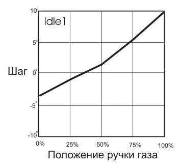 Кривая шага имеет самую простейшую форму: это прямая линия от минимального значения шага до максимального, проходящая, конечно, через 0. При недостаточной мощности двигателя некоторые пилоты рекомендуют сделать ее в виде ломаной линии с центральной точкой в +2 градусах. Модель получает максимально возможные динамические характеристики.