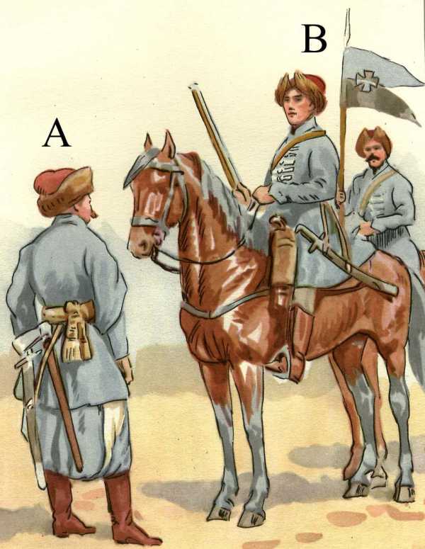Где-то в это же время произошли и изменения в комплектации хоругвей личным составом: если изначально в них служили степные козаки, то теперь основу составляли шляхтичи, чьё материальное состояние не позволяло им служить в гусарах. Как и гусары, козацкие хоругви относились к автораменту народовому и комплектовались по системе «товарищества». Среди козаков широко распространилось огнестрельное оружие, а также восточный круглый щит-калкан. Он изготавливался из прутьев смоквы и в диаметре достигал 40–60 см.
