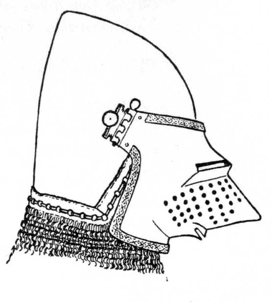 Последнее усовершенствование заключалось в усилении защиты горла, которое бармица защищала недостаточно надежно, эта часть была закрыта железным подбородником. Так появился большой бацинет (Grand-bascinet).