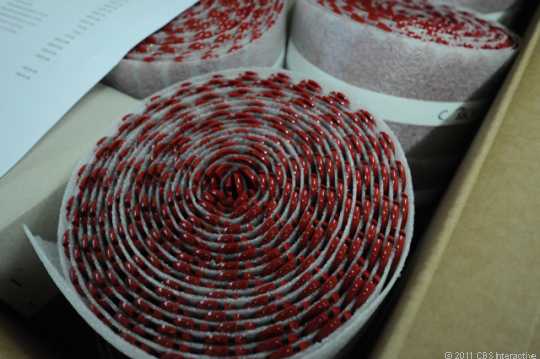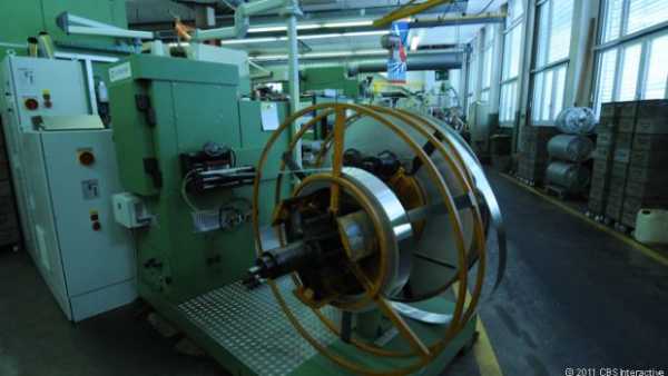 Заготовки лезвий укладываются на конвейер. Они отправятся в печь, где они подвергнутся воздействию температуры в 1050 градусов для того, чтобы закалить нержавеющую сталь. Это увеличит срок их эксплуатации на десятилетия.
