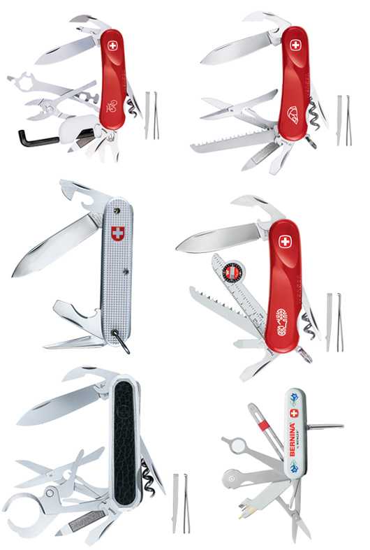 Здесь можно увидеть эволюцию швейцарского армейского ножа, начиная с оригинальной модели 1891 года в правом нижнем углу. В правом верхнем углу находится новейшая модель, выпущенная в 2008 году. Предыдущая модель, сделана в 1968 году, находится в верхнем левом углу. Офицерский нож 1931 года выпуска находиться в нижнем левом углу. А по центру находится одна из последних моделей с красной рукояткой.