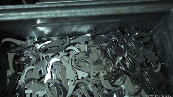 13. После того, как они выходят из штамповочной машины, специальный аппарат трясет контейнер с лезвиями для швейцарских ножей, чтобы отвалились лишние кусочки металла, которые могли случайно пристать к поверхности лезвий.