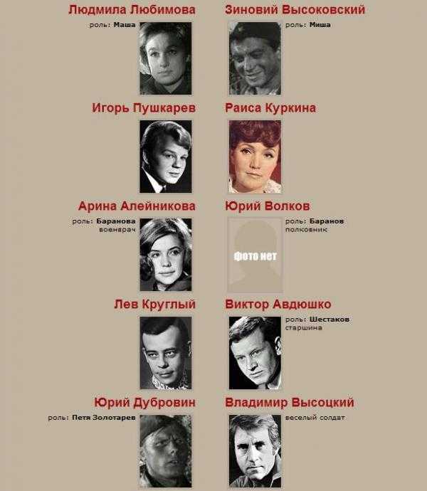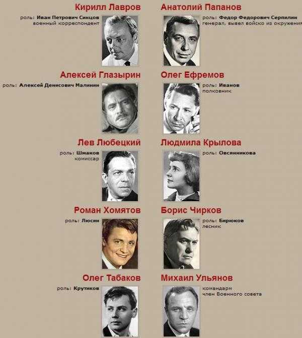 В «Живых и мёртвых» снялась целая «краснознамённая дивизия» великих актёров. Кроме Лаврова, Папанова и Ефремова — Евгений Самойлов, Борис Чирков, Римма Маркова, Владимир Высоцкий и многие другие. Михаил Ульянов в роли командующего армией Сергея Викторовича, Михаил Глузский в роли генерала Орлова, Олег Табаков в роли старшего лейтенанта, особиста Крутикова.