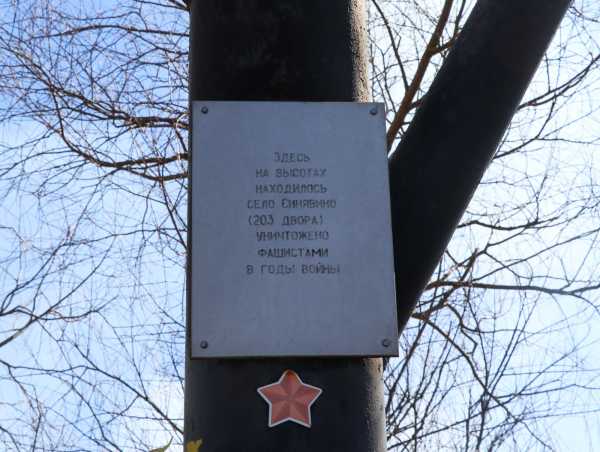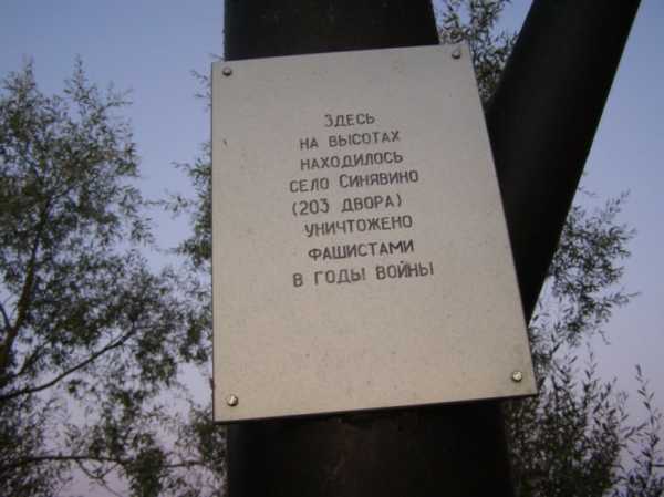 Второй мемориал посвящён уничтоженному селу Синявино. Немцы захватили село в 1941 году и освободили лишь в 1944, уже после прорыва блокады. К тому времени от деревни, состоящей из 203 домов, не осталось и следа. Теперь название «Синявино» носит садоводство, построенное уже после войны и находящееся севернее.